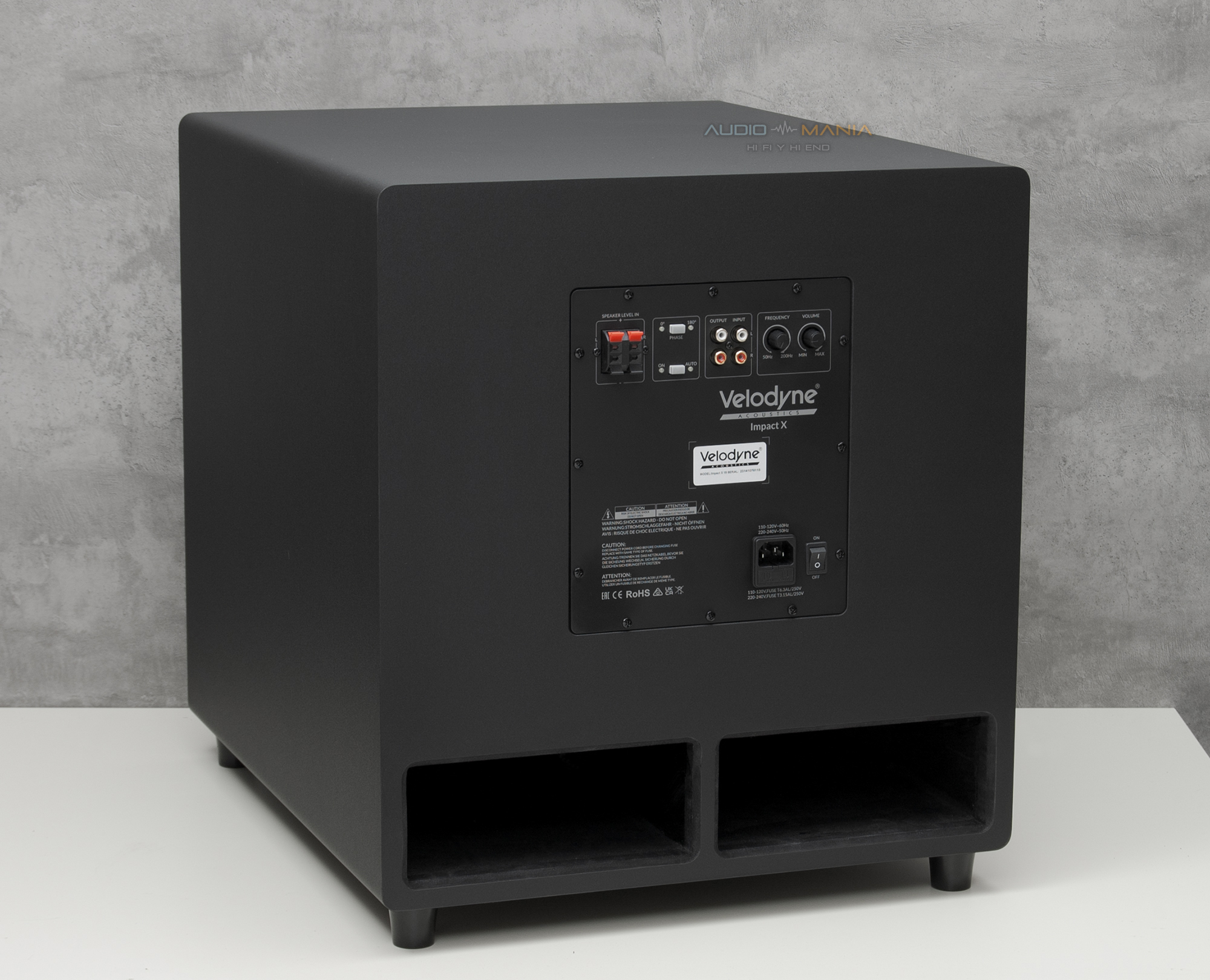 • Conectividad: Entradas RCA estéreo y LFE; entrada de alto nivel (para amplificadores sin salida de subwoofer); salida RCA / LFE